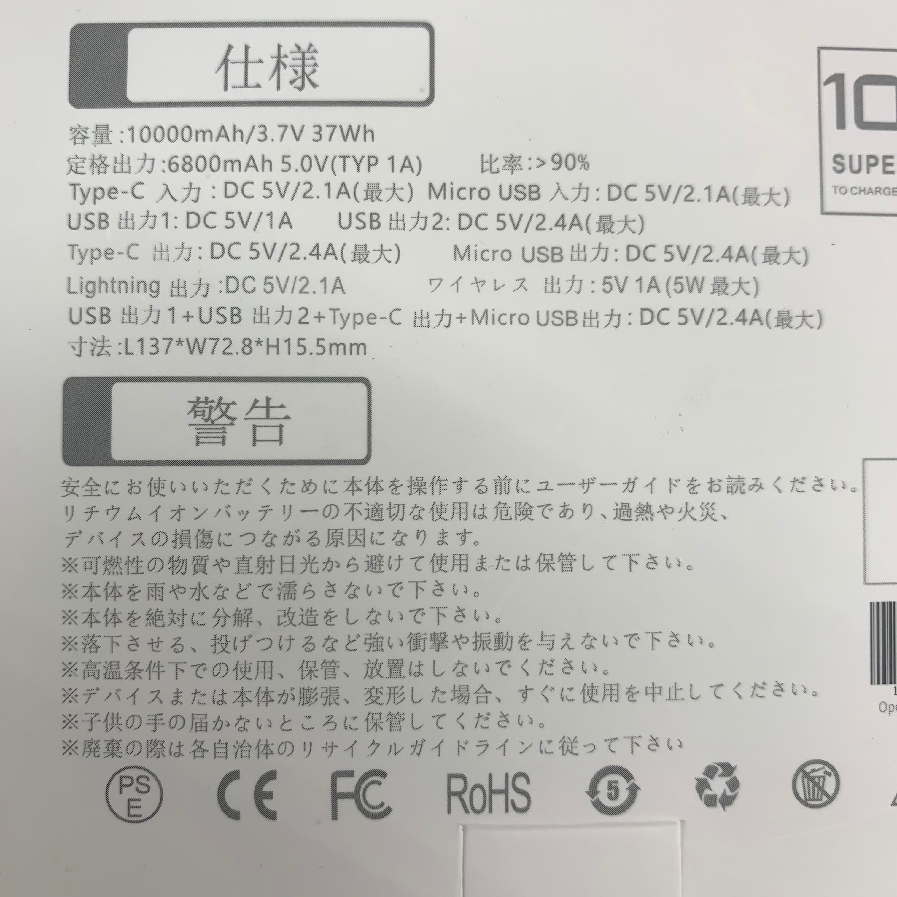 Type-C出力:DC5V/2.4A MicroUSB出力:DC5V/2.4A